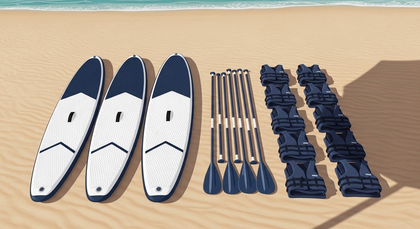 Nous livrons un pack complet prêt à l’emploi (paddles, pagaies, gilets, accessoires) + un stock de rechange pour remplacement rapide en cas d’usure ou de perte.